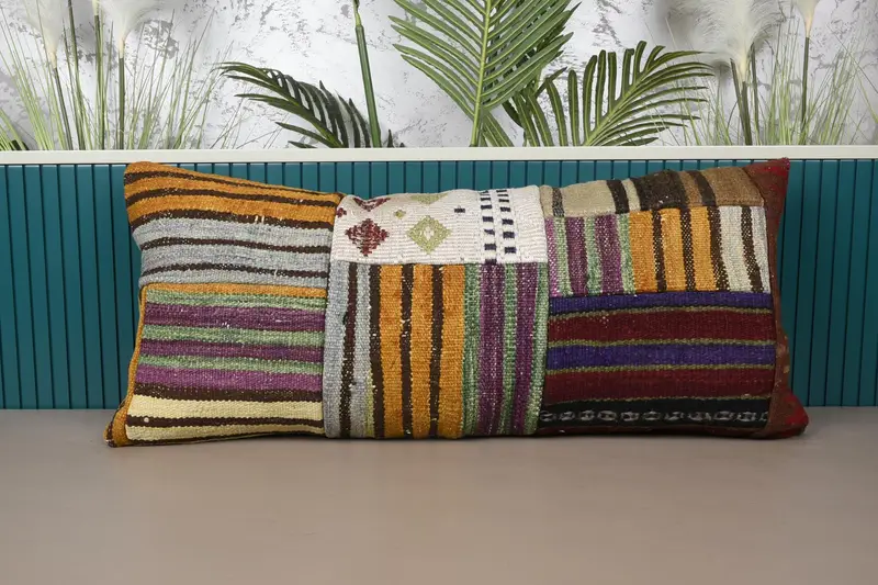 Handgefertigtes grünes Leinenkissen, 16x36 Vintage Patchworkkissen