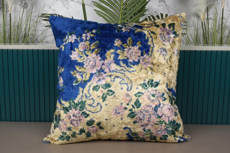 Handgewebtes blaues Leinenkissen, Vintage besticktes Blumenkissen