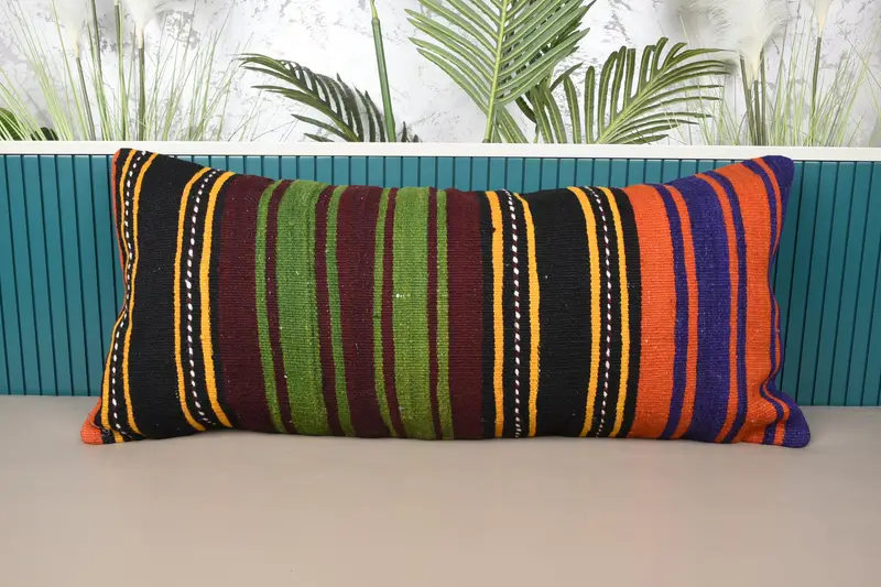 Handgefertigtes grün & bronze gestreiftes Kissen, Vintage Rechteckkissen