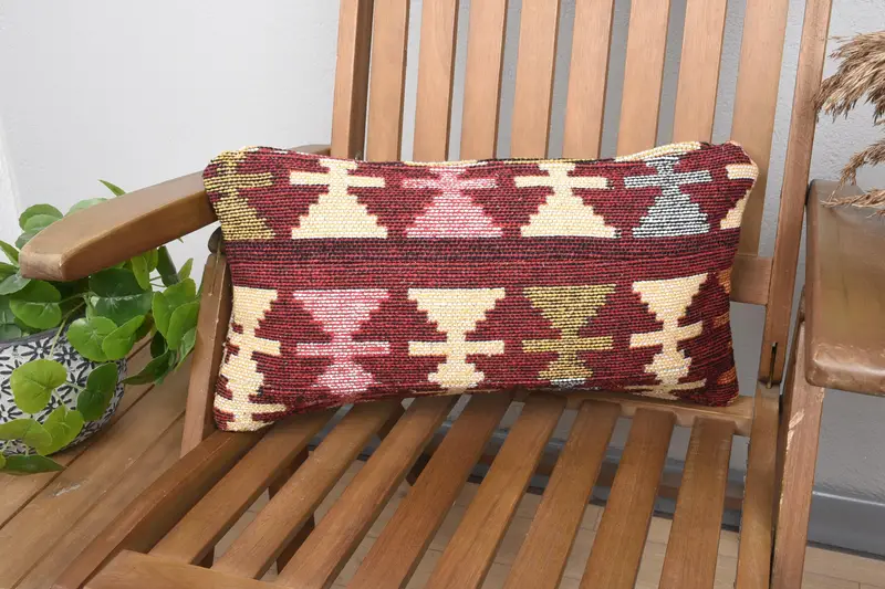 Gesticktes geometrisches Kissen in Rot und Rosa, handgefertigtes Leinenkissen