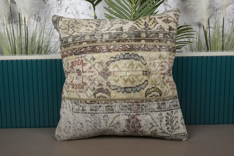 Beige & braunes Patchwork-Wurfkissen, Vintage besticktes Kissen