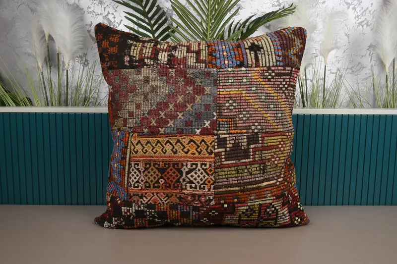 Rot & Bronze Patchwork Kissen, handgemachtes besticktes Leinenkissen
