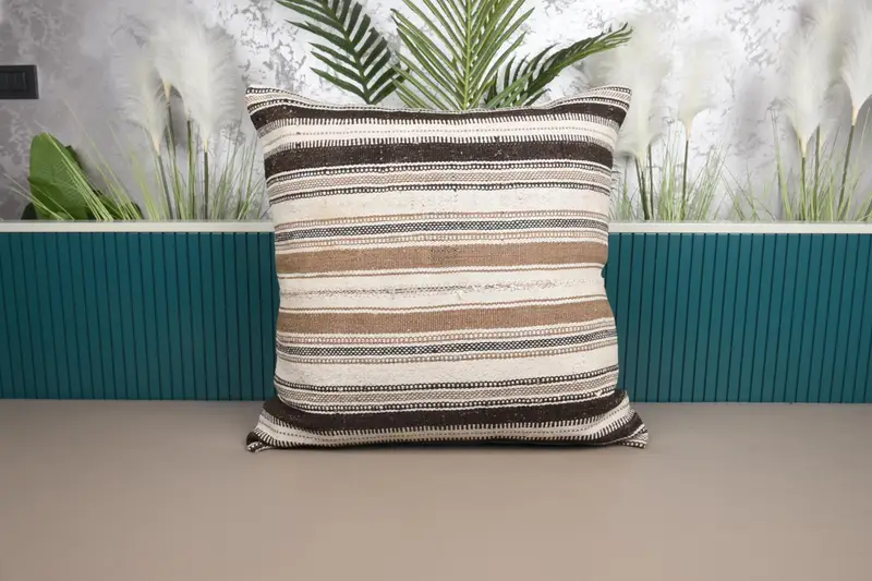 Beige & braunes Patchwork-Wurfkissen, besticktes Vintage-Kissen