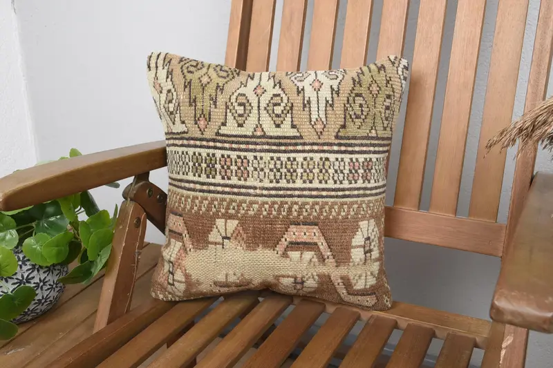 Braunes und beiges Kelim-Wurfkissen, 14x14 besticktes Kissen