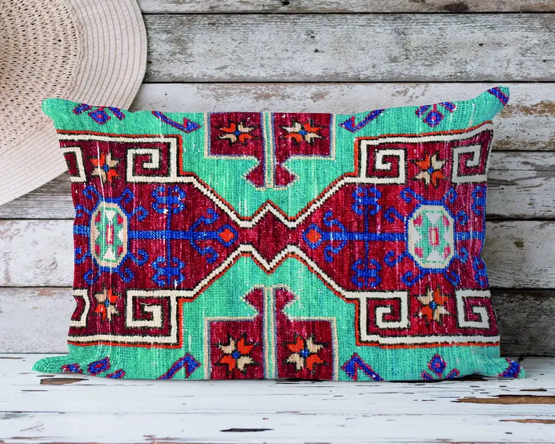 Handgefertigtes besticktes Beige- und Grün-Wurfkissen, Boho-Akzentkissen