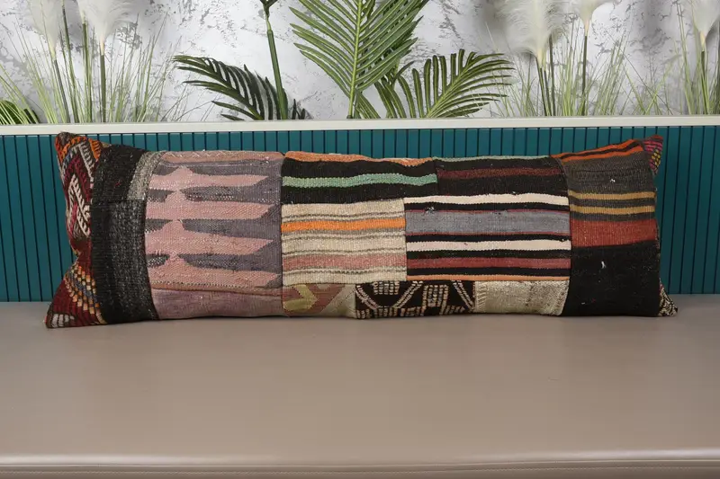 Besticktes Patchwork-Kissen in Braun und Beige, 16x48 handgemachtes Wurfkissen