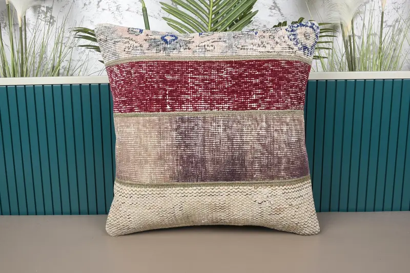 Rotes und beiges Patchwork-Wurfkissen, besticktes Vintage-Kissen