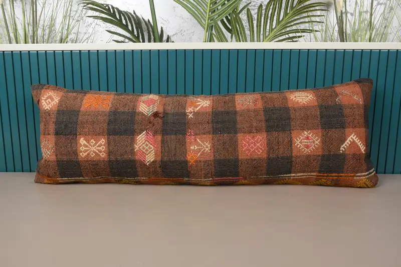 Handgefertigtes braun & orange gestreiftes Kissen, Vintage besticktes rechteckiges Kissen