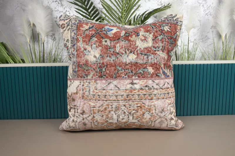 Rot-orangefarbenes Patchwork-Wurfkissen, 28x28 besticktes Kissen