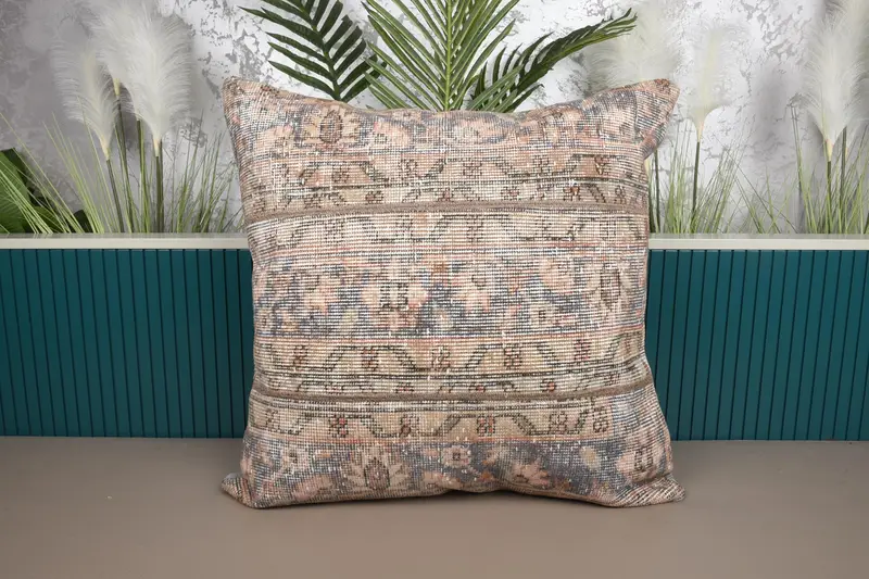 Blaues und beiges Patchwork-Wurfkissen, besticktes Vintage-Kissen