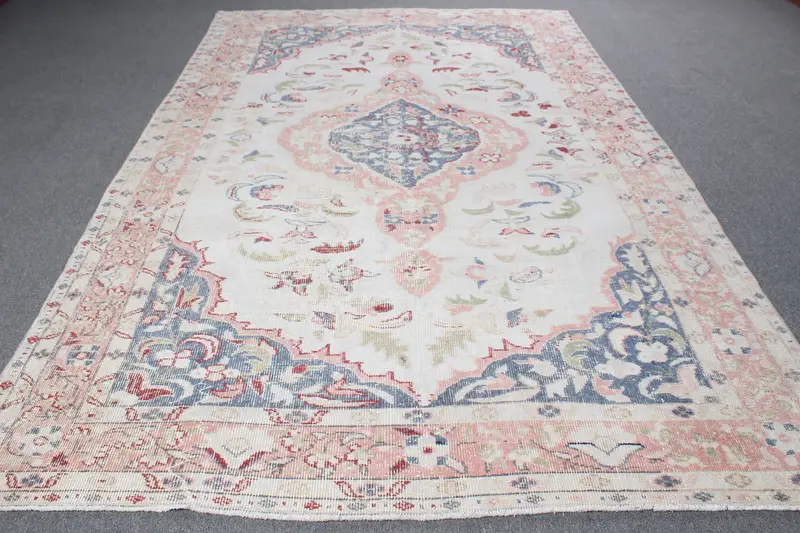 Eleganter weißer Orientteppich, 5,4 x 8,5 Fuß mit rosa Akzenten
