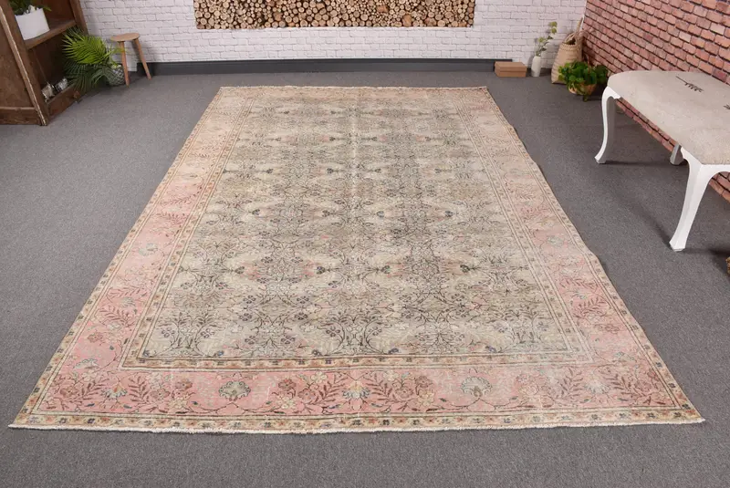 Grüner Ikat-Teppich, 6,2 x 9,2 Fuß mit rosa Akzenten