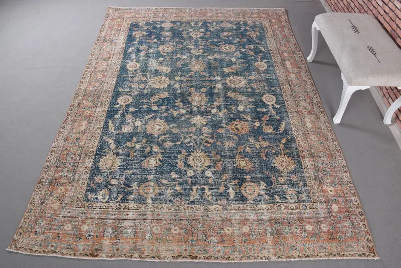 Blauer Blumenteppich, 6,9 x 9,6 Fuß mit orangefarbenen Akzenten