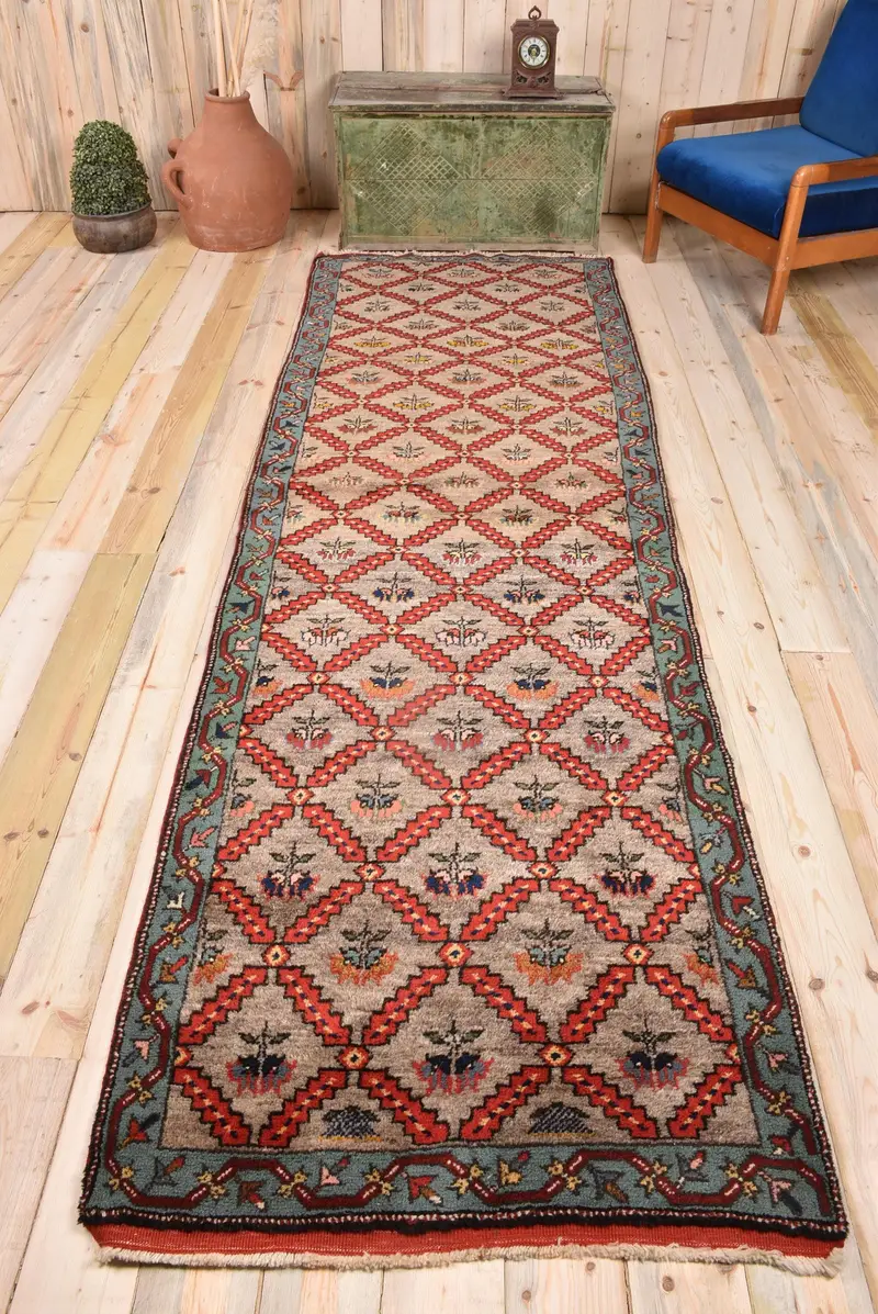 Eleganter grauer Orientteppich, 3,1 x 10,4 Fuß mit roten Akzenten