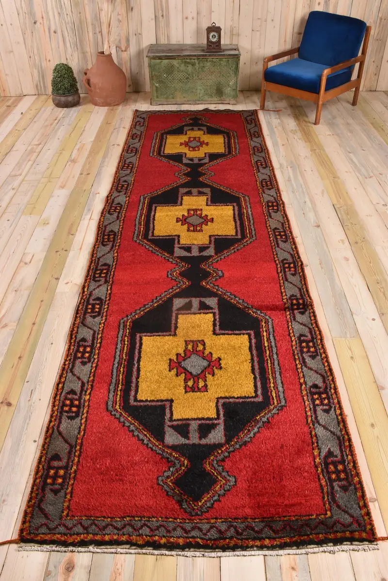 Roter Südwestteppich, 4 x 13,6 Fuß mit gelben Akzenten