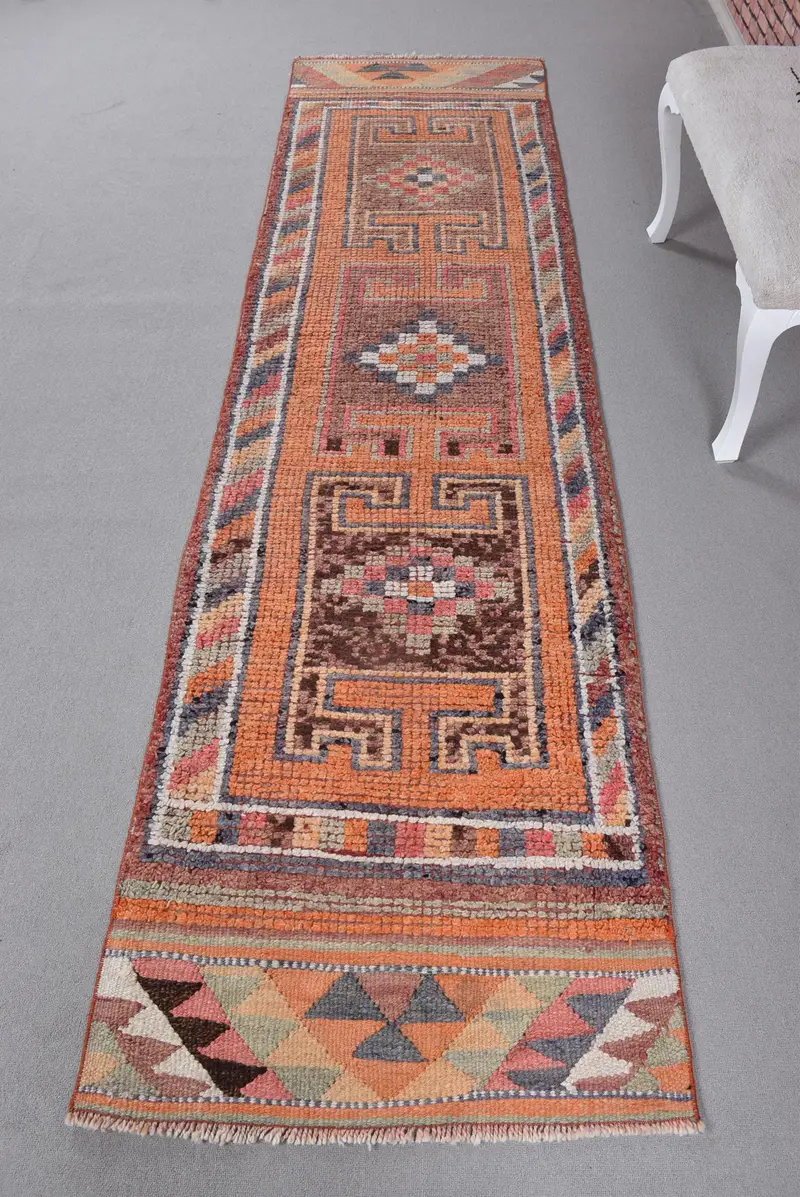 Orangefarbener und blauer Patchwork-Teppich, 2,7 x 10,3 Fuß, lebendiges Dekor