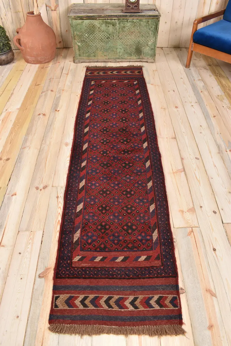 Geometrischer Teppich in Rot und Schwarz, 1,9 x 8,1 Fuß, schickes Dekor