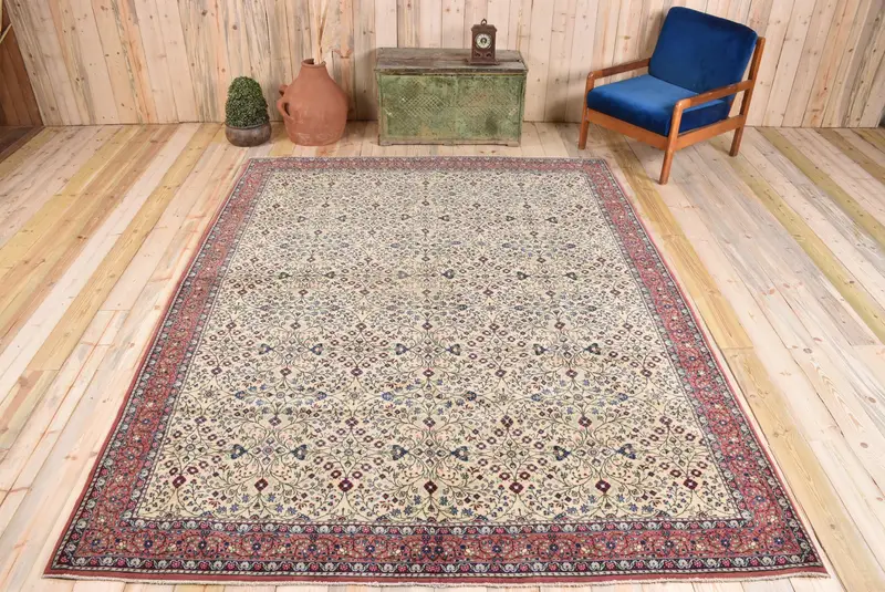 Eleganter beige-blauer Blumenteppich, 7,3x9,5 Fuß