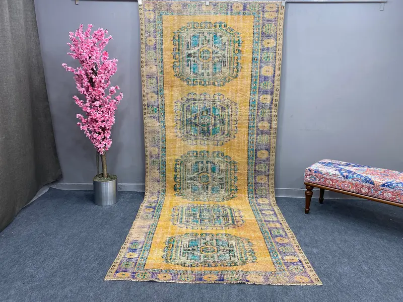 Leuchtender orangefarbener Teppich, 4,5 x 11 Fuß großes, blau umrandetes Design