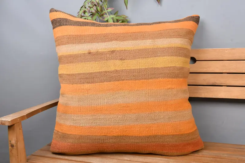 Orange & braun gestreiftes Kissen, handgefertigtes besticktes Leinenkissen