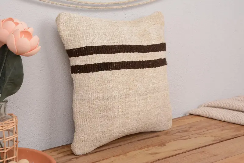 Beige & braun gestreiftes Wurfkissen, Vintage besticktes Kissen