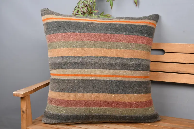 Grün-braun gestreiftes Kissen, besticktes Vintage-Kissen