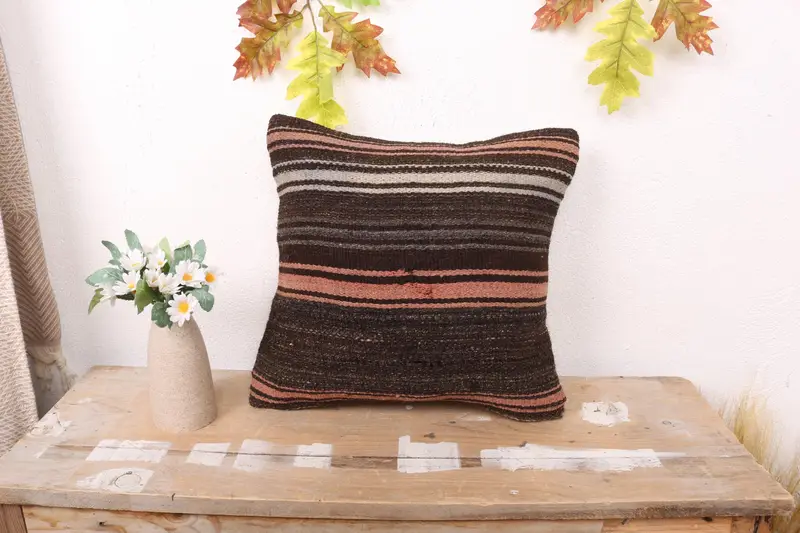 Braun & rosa gestreiftes Kelimkissen, besticktes Wurfkissen