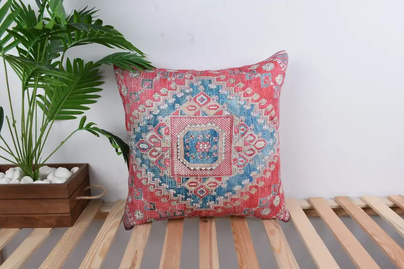 Handgefertigtes blau-rot gestreiftes Kissen, quadratisches Vintage-Kissen