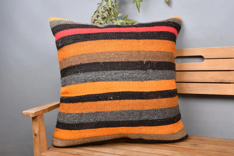 Orange & braun gestreiftes Kissen, Vintage besticktes Kissen