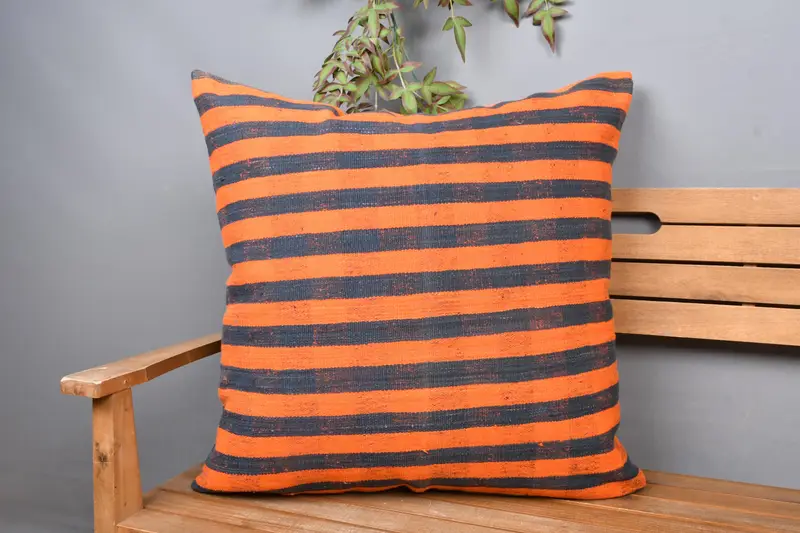 Orange & Braun gestreiftes Kissen, handgemachtes Vintage Leinenkissen