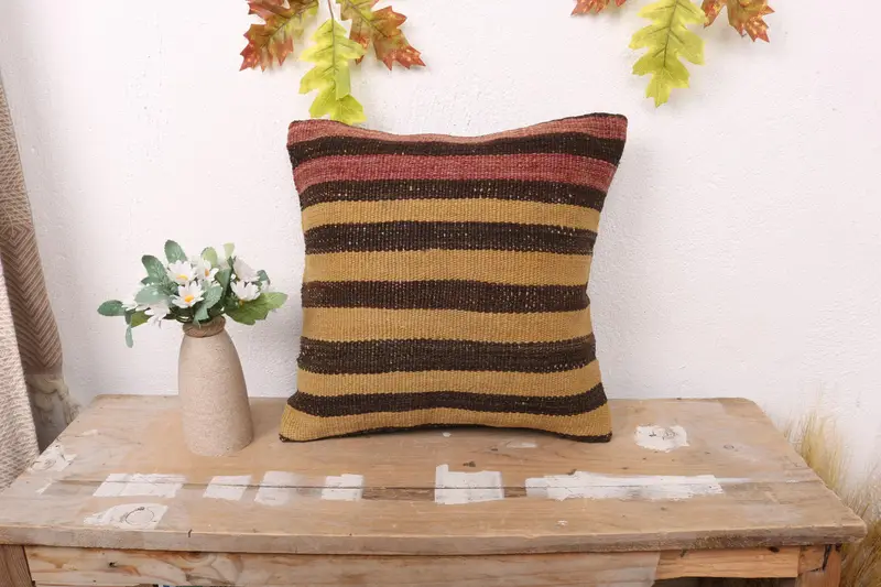 Beige & braun gestreiftes Kissen, handgefertigtes besticktes Kissen