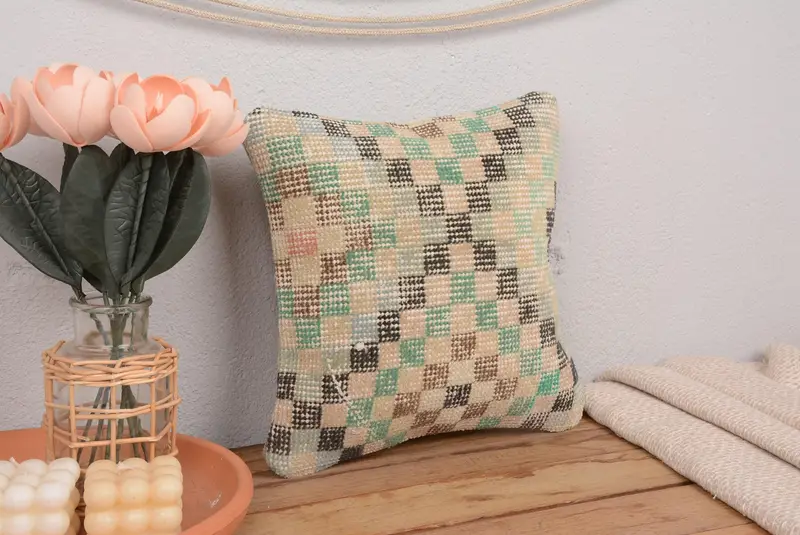 Grün & Braun gestreiftes besticktes Wurfkissen, handgemachtes Vintage Kissen