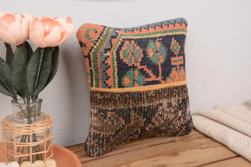 Besticktes Patchwork-Kissen in Blau und Orange, handgefertigtes Vintage-Kissen