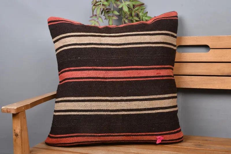 Braun & rot gestreiftes Leinenkissen, Vintage besticktes Kissen