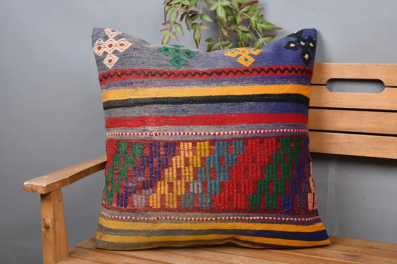 Blaues und rotes geometrisches Kissen, Vintage besticktes Kissen