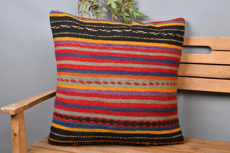 Rot-braun gestreiftes Kissen, Vintage besticktes Leinenkissen