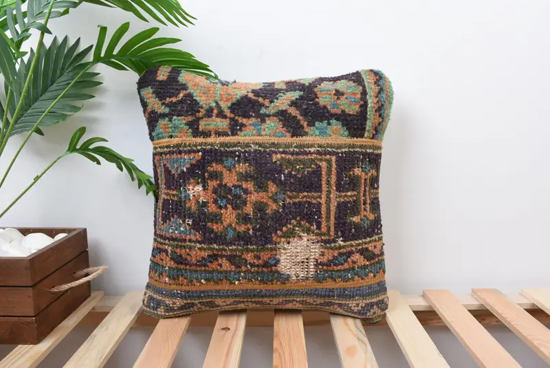 Grünes und orangefarbenes Patchwork-Wurfkissen, 16x16 besticktes Kissen