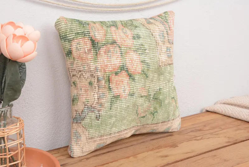 Grünes und braunes Blumen-Kelim-Wurfkissen, Vintage-gesticktes Kissen
