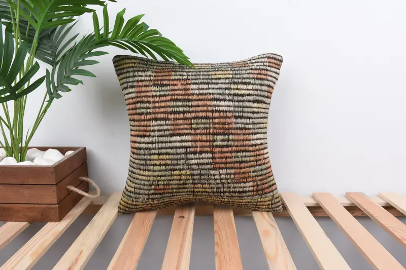 Orange & Grün besticktes Wurfkissen, handgemachtes Vintage Kissen