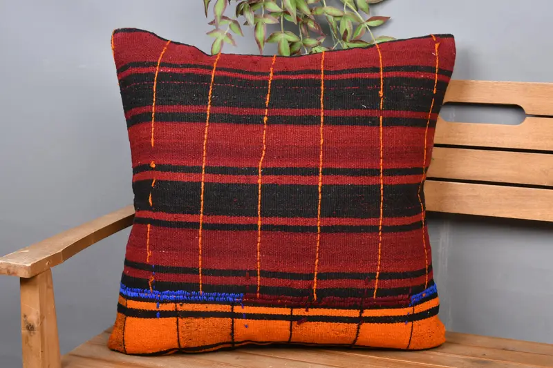 Gesticktes rot-orange gestreiftes Kissen, handgefertigtes Vintage-Kissen