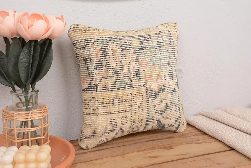 Besticktes Beige & Braunes Blumenkissen, handgemachtes Vintage Kissen