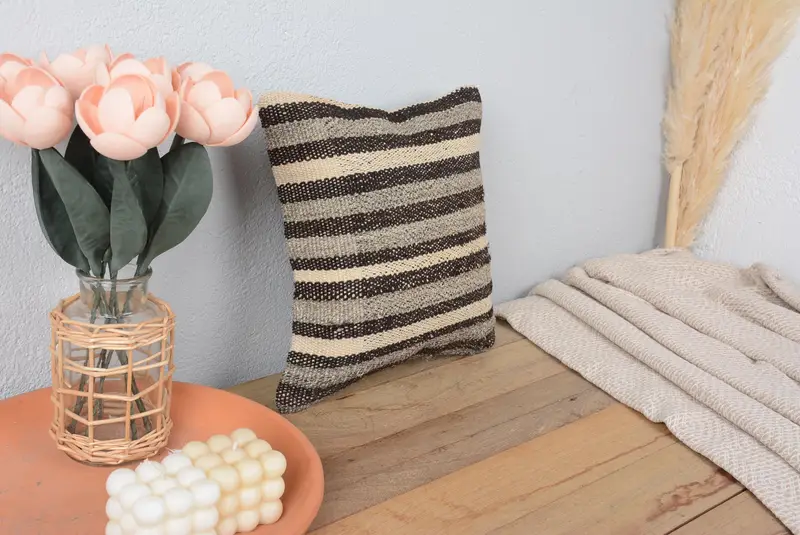 Beige & braun gestreiftes Wurfkissen, Vintage besticktes Kissen