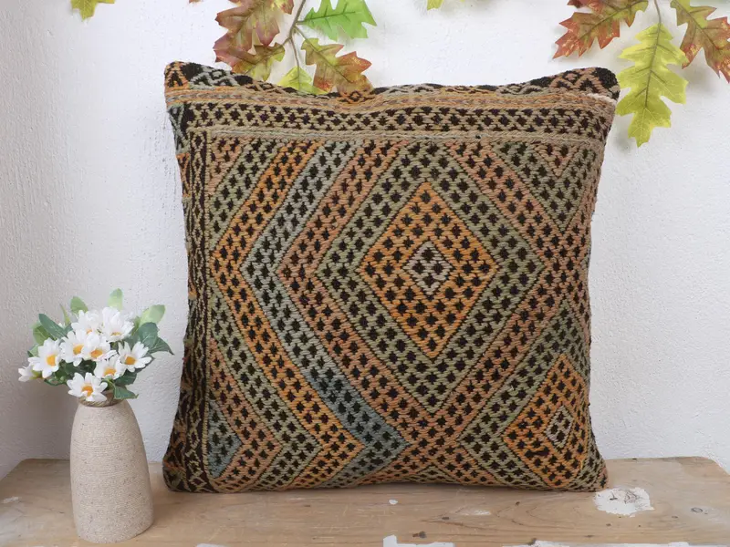Braun & Orange besticktes geometrisches Kissen, handgemachtes Vintage Kissen