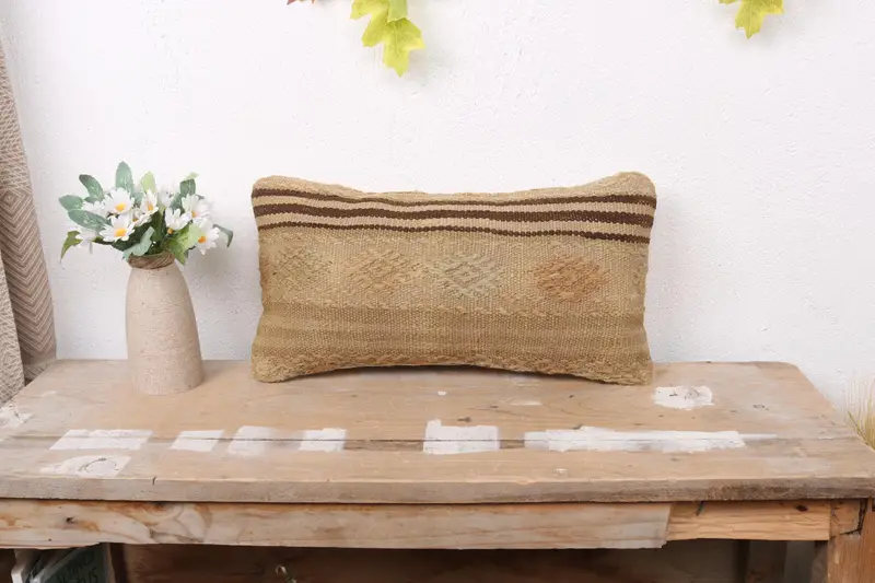 Beige & braun gestreiftes Wurfkissen, Vintage besticktes Kissen