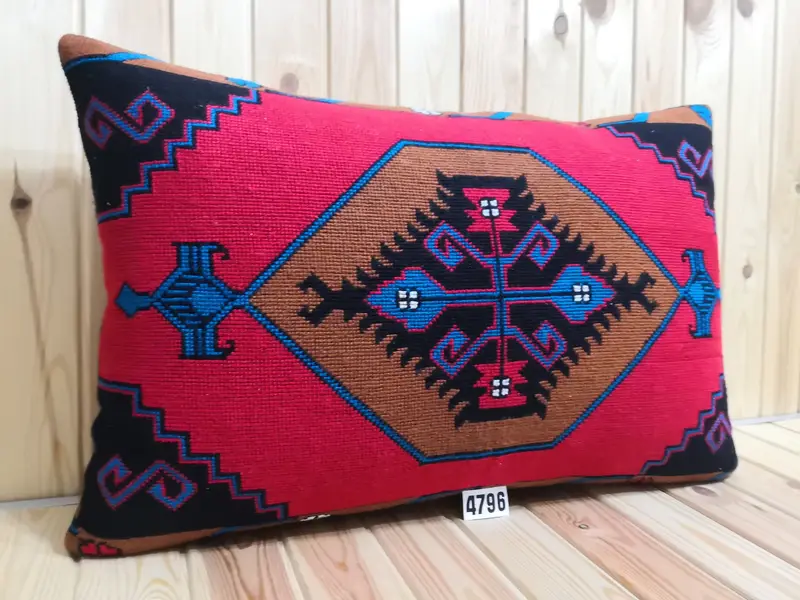 Handgefertigtes geometrisches Woll-Wurfkissen in Rot und Bronze, rechteckiges 18x28-Zoll-Kissen