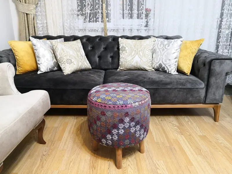 Handgefertigtes 17x16 Zoll blaues und rotes geometrisches Wollkissen, Vintage-Dekor