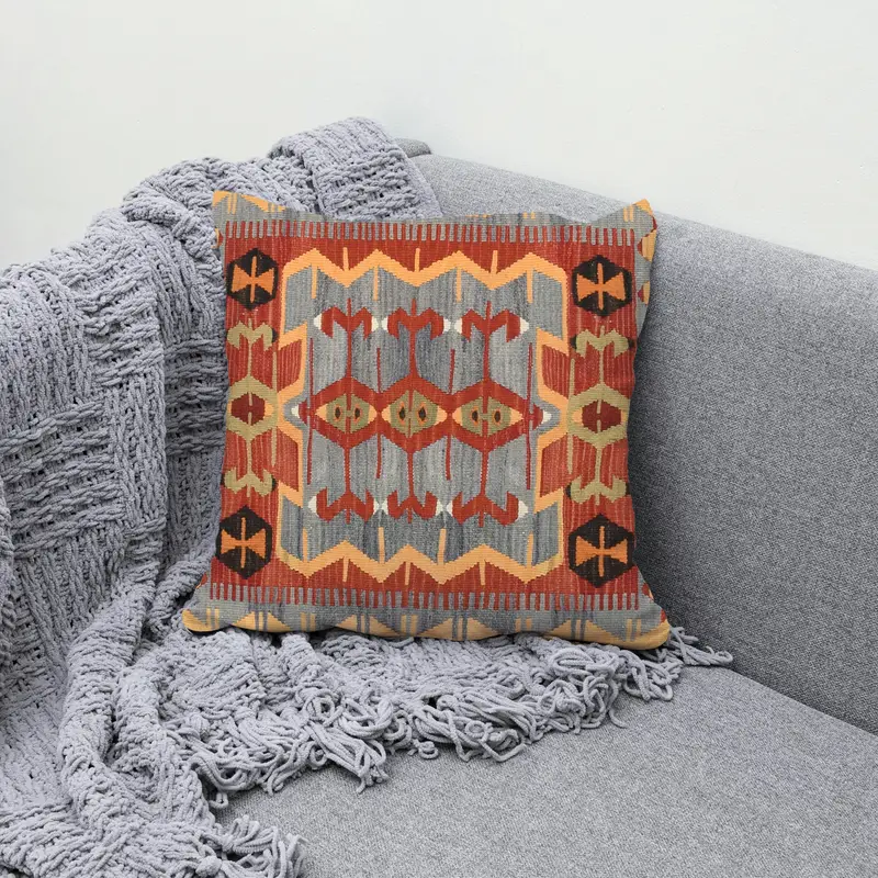 Besticktes grau-orangefarbenes Wurfkissen, Vintage-Kissen mit Reißverschluss