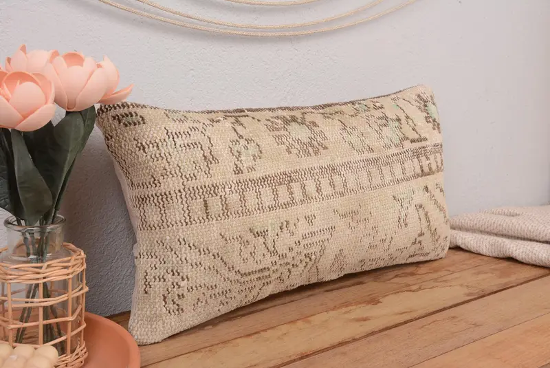 Beige & braun geblümtes Leinenkissen, 12x24 besticktes Wurfkissen