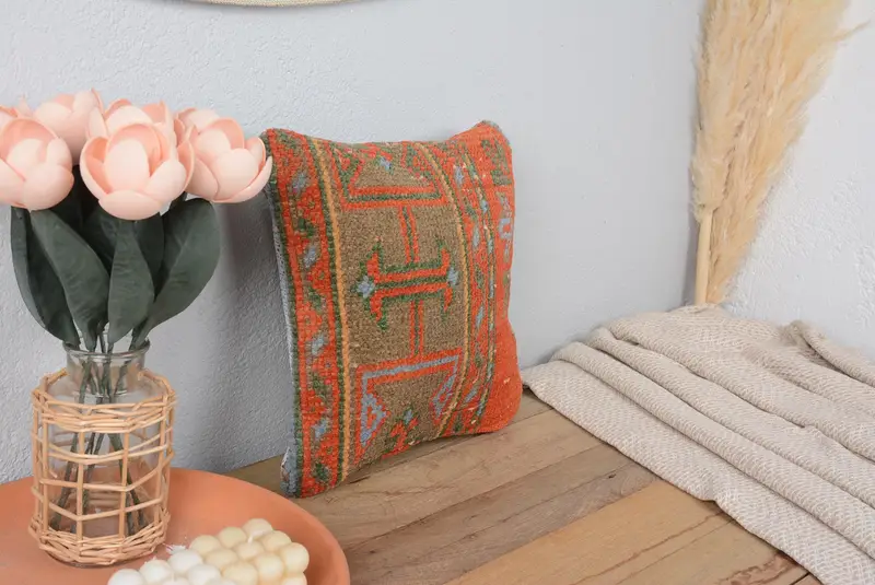 Geometrisches Kissen in Orange und Grün, Vintage-gesticktes Kissen