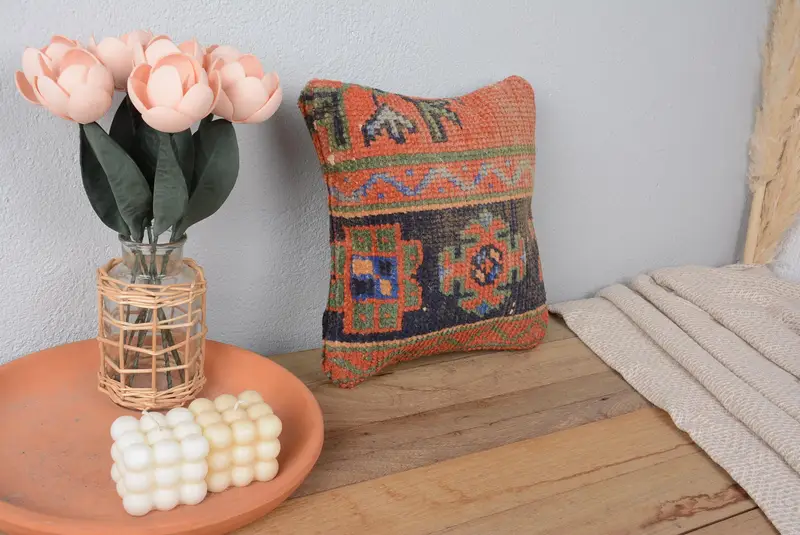 Handgefertigtes orange-grünes Blumenkissen, 12x12 besticktes Kissen